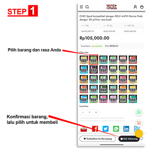 Jika diperlukan, silakan pilih tipe/warna/rasa, gudang, dan jumlah barang. Kemudian klik "Tambah ke Keranjang" atau "Beli Sekarang".