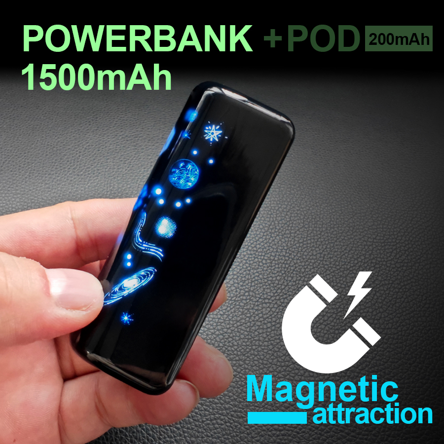 Produk ini mengadopsi desain magnetic terpisah yang inovatif, di mana baterai dan POD dapat dipisahkan serta dipasangkan kembali secara magnetic. Ruang baterai memiliki kapasitas besar 1500mAh, sedangkan POD sendiri dilengkapi baterai 200mAh. POD hadir dengan desain tangki cairan besar 15ml yang kosong, memungkinkan Anda mengisi cairan vape sesuai keinginan. Panelnya dilengkapi lampu LED bernapas dengan motif langit bintang yang sangat mewah dan modern.